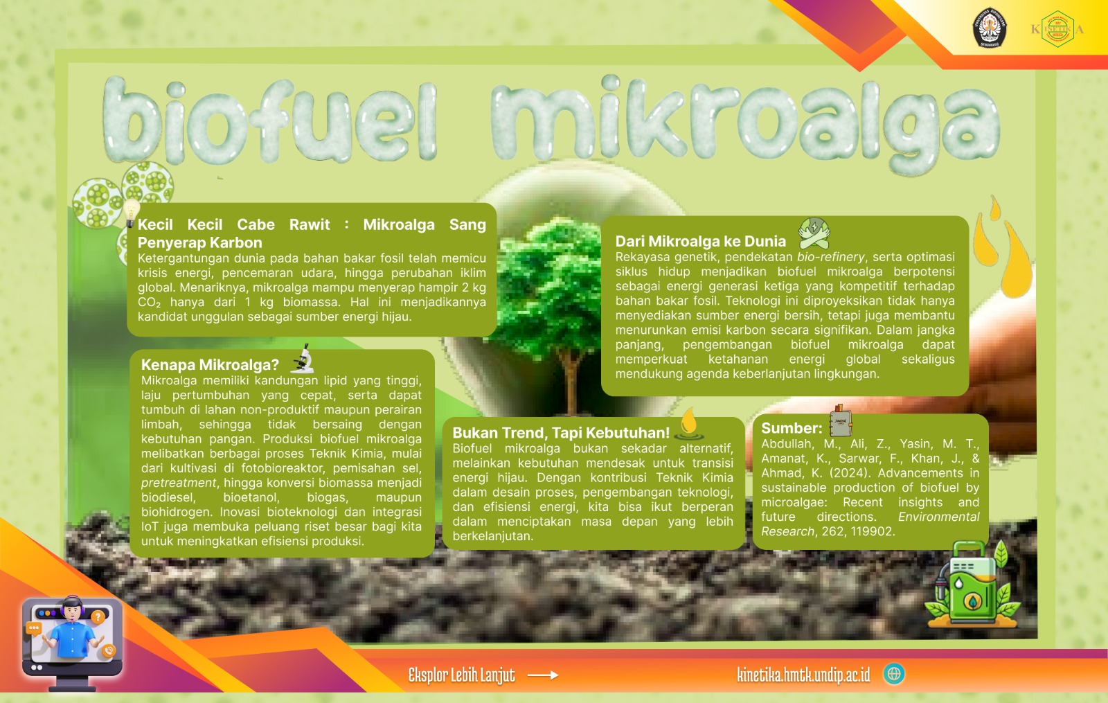 Mikroalga memiliki kandungan lipid yang tinggi, laju pertumbuhan yang cepat, serta dapat tumbuh di lahan non-produktif maupun perairan limbah, sehingga tidak bersaing dengan kebutuhan pangan. Produksi biofuel mikroalga melibatkan berbagai proses Teknik Kimia, mulai dari kultivasi di fotobioreaktor, pemisahan sel, pretreatment, hingga konversi biomassa menjadi biodiesel, bioetanol, biogas, maupun biohidrogen. Inovasi bioteknologi dan integrasi IoT juga membuka peluang riset besar bagi kita untuk meningkatkan efisiensi produksi.