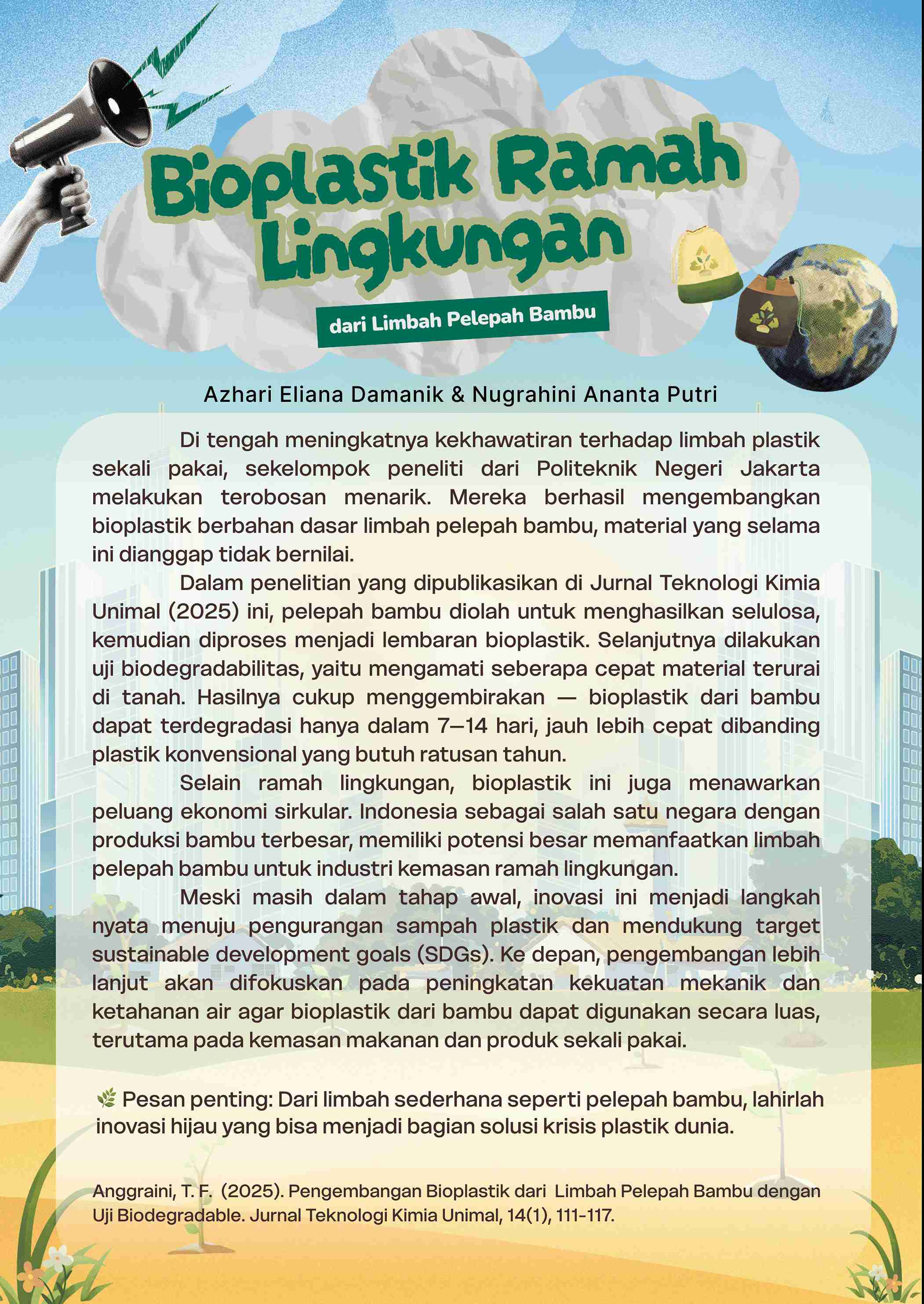 - Artikel: Bioplastik Ramah Lingkungan dari Limbah Pelepah Bambu inovasi bioplastik berbahan dasar bambu yang berpotensi menggantikan plastik konvensional.