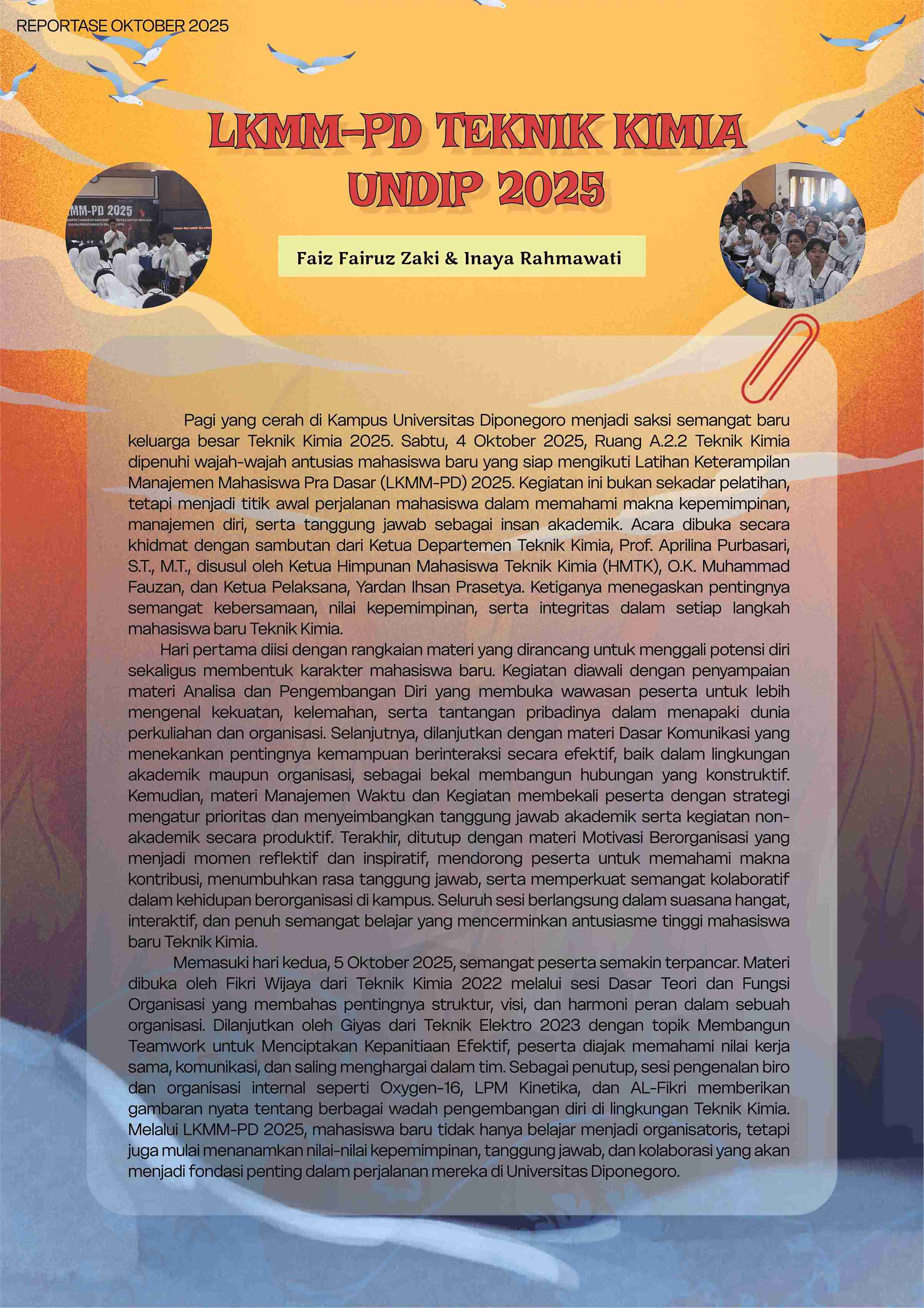 - Reportase: LKMM-PD Teknik Kimia UNDIP 2025, liputan semangat dan pembelajaran mahasiswa baru dalam menumbuhkan kepemimpinan dan kolaborasi di dunia perkuliahan.