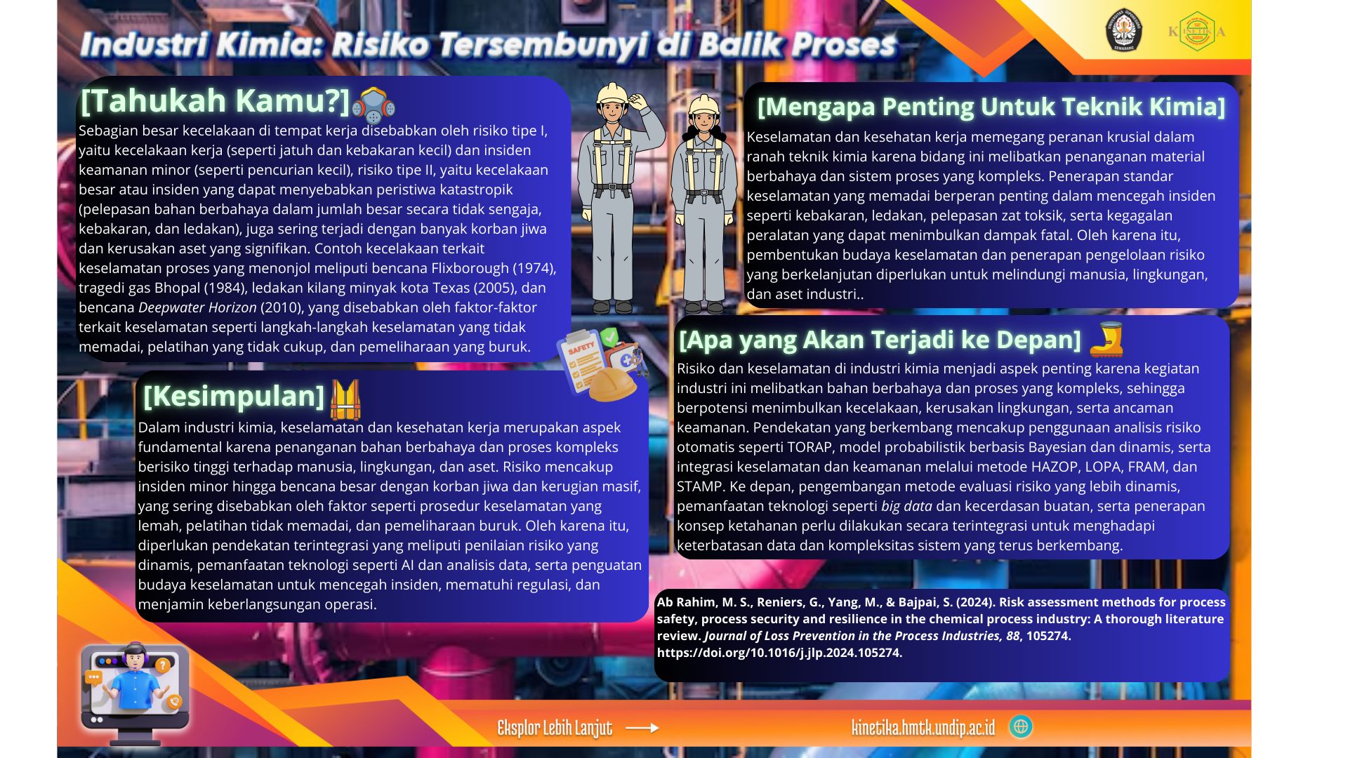 Sejumlah peristiwa besar dalam sejarah industri kimia, seperti bencana Flixborough (1974), tragedi gas Bhopal (1984), ledakan kilang Texas City (2005), dan insiden Deepwater Horizon (2010), menunjukkan bahwa kegagalan sistem keselamatan dapat menyebabkan korban jiwa, pencemaran lingkungan, serta kerugian ekonomi yang sangat besar.